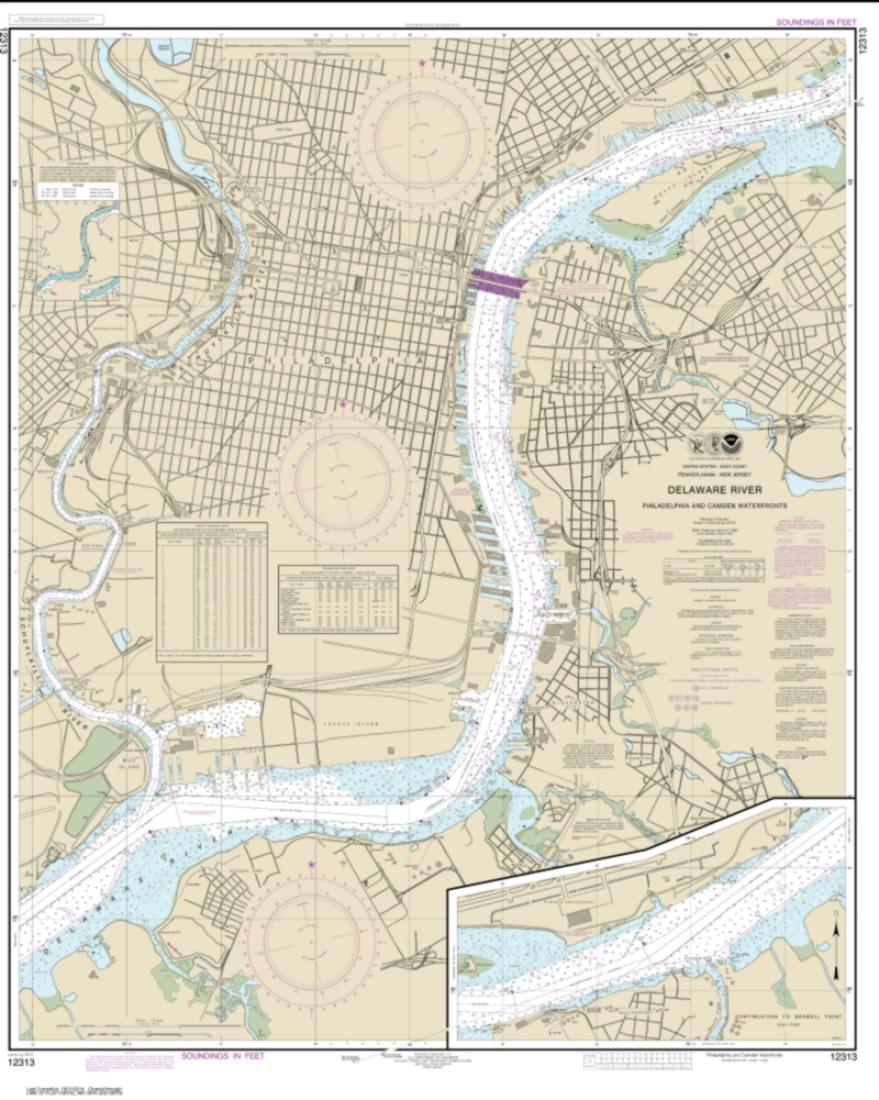 East View Map Link (EVML), a certified NOAA and NGA print on demand printer; provides mariners with up-to-date National Oceanic and Atmospheric Administration (NOAA) approved nautical charts. Our Philadelphia and Camden Waterfronts nautical chart (Map Index 12313) is printed using high resolution, heavy weight and acid free paper. All charts are printed with the latest Notice to Mariners (NTMs), and meet United States Coast Guard and international carriage requirements for commercial and recreational vessels. Waterproof options are also available. All NOAA nautical charts ship rolled, and are printed by East View Map Link, LLC.